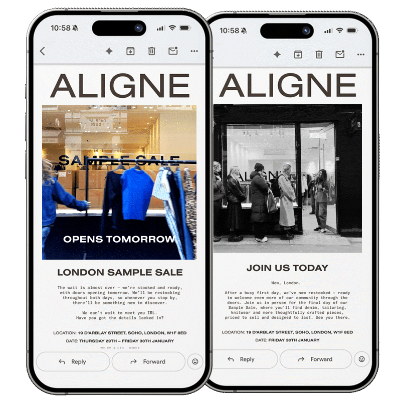 Messaging was handled sensitively throughout, aligning with the brand’s sustainable ethics by framing the sale around “keeping styles in circulation” rather than mass consumption. Traffic was driven through a mix of paid and organic social, alongside homepage placement, with all touchpoints adapting once the sale went live – revealing the location, leveraging reactive motion-led email to drive urgency, and continuing to build a new CRM segment for future events.