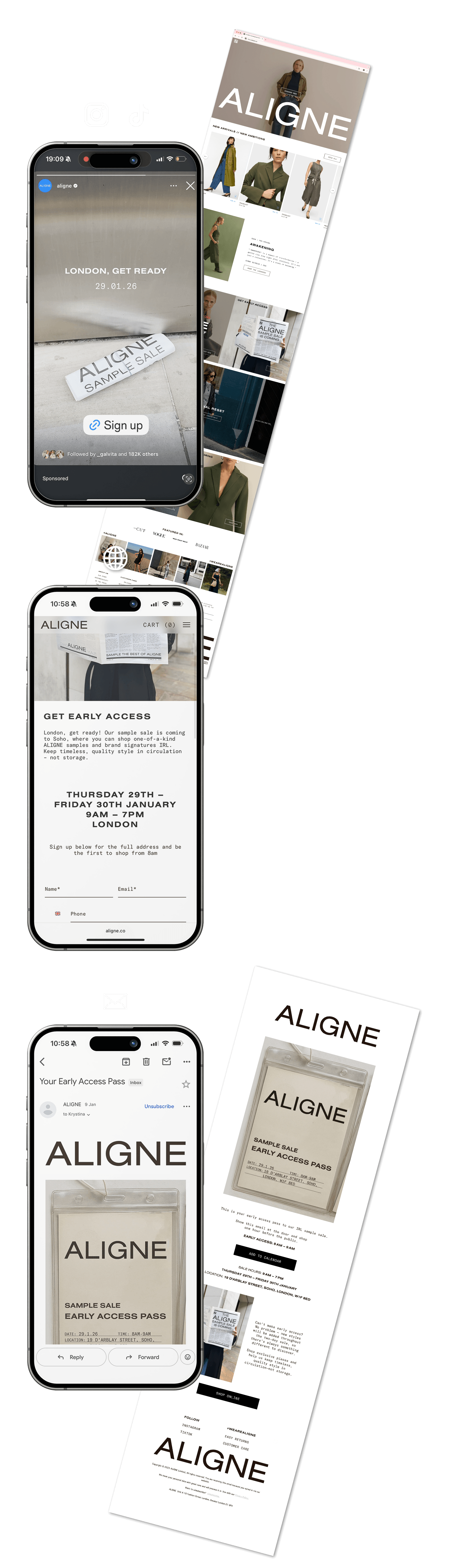 Utilising Shopify CMS, the campaign spanned site-wide to support high-intent conversion. Motion on the hero creative added immediacy and engagement, elevating a refined, slightly edgier aesthetic designed to reinforce ALIGNE’s “women who are going places” positioning while remaining firmly rooted in a sale context. The campaign also nodded to the in-person event without alienating customers outside London, ensuring inclusivity across US and ROW markets.